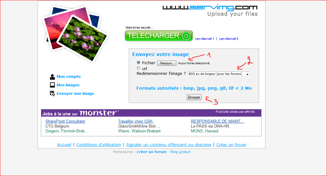 La dernière méthode consiste à se rendre sur un site d' hébergeur d'image, par exemple servimg, lequel servira pour les illustrations de ce tutorial.